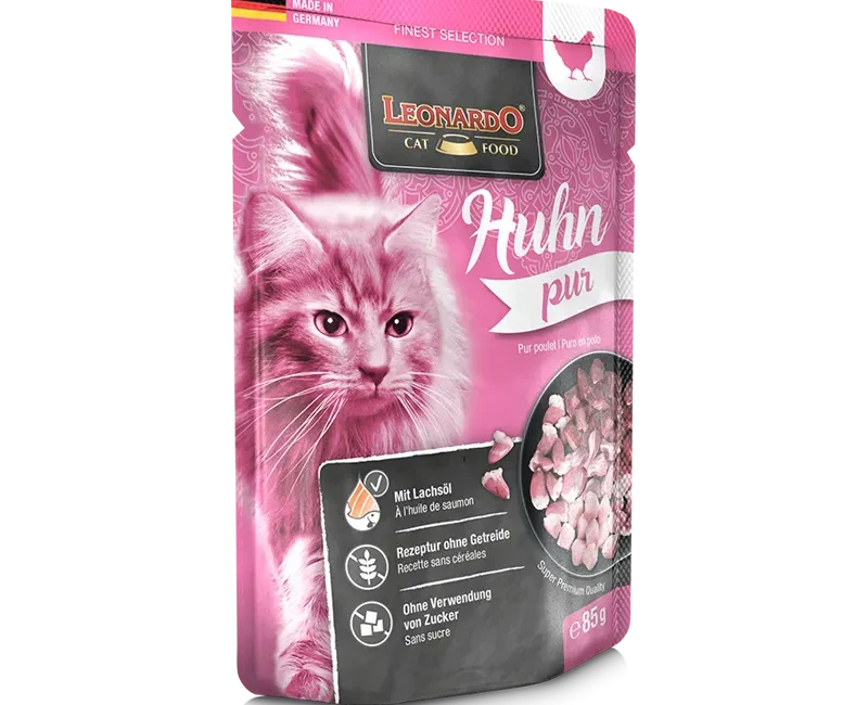 La irresistible mezcla de carne magra de pollo de alta calidad, sabrosos despojos y aceite de salmón con ácidos grasos poliinsaturados hace que LEONARDO puro en pollo sea un claro favorito en el cuenco. Aumenta el factor ronroneo y da un bonito brillo al pelaje.